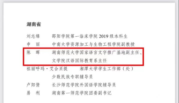 (通讯员 吴文莉 苏静怡)经基层申报、省级团委审核推荐、组织评议等环节,我校国家语言文字推广基地副主任、汉语国际教育系主任陈晖教授荣获2022年全国大中专学生志愿者暑期文化科技卫生“三下乡”社会实践活动优秀个人奖。