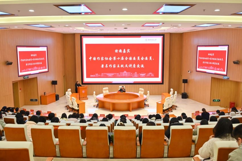 王跃文作为特邀嘉宾,以小说《家山》为例,与同学们分享小说创作经验。他强调,小说创作要贴近现实,突出美好的人与物。在交流环节,同学们积极提问,王跃文结合具体案例和个人写作经验一一进行解答。仪式最后,王跃文赠予提问同学签名书籍并合影留念。