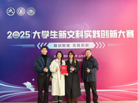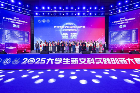 (通讯员潘梦)11月28日至30日,2025年大学生新文科实践创新大赛决赛在陕西西安举行。由丛杨、刘宓蜜老师指导,潘梦、龙心怡等同学创作的项目《“数智非遗经济人”——基于数字创意的非遗朋克IP活态传承计划》获国赛金奖。