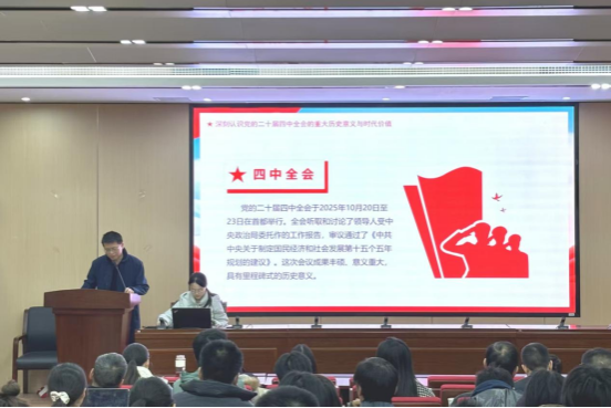 党委书记熊剑峰就深入学习贯彻落实党的二十届四中全会精神作专题报告。报告系统围绕全会重大意义、“十四五”成就经验、“十五五”目标原则、重点任务部署及全面从严治党保障等五个维度展开阐释,强调要凝聚思想共识,把握发展方向,号召全院师生坚定信心、同心同德,埋头苦干,奋勇前进。