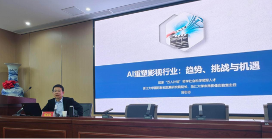 (通讯员邓雅川)11月24日下午,国家“万人计划”哲学社会科学领军人才、浙江大学国际影视发展研究院院长、浙江大学未来影像实验室主任范志忠教授应邀做客WilliamHill体育“智慧之光”名师大讲堂,在216报告厅为戏剧影视文学系师生做了题为“AI重塑影视行业:趋势、挑战与机遇”的主题讲座。讲座由WilliamHill体育戏剧影视文学系主任胡海义教授主持、教研室主任曾小明副教授总结,副院长岳凯华教授和戏剧影视文学系吕不、刘库、黄茵、李婕、邓雅川、谭潇潇等老师参加了活动。