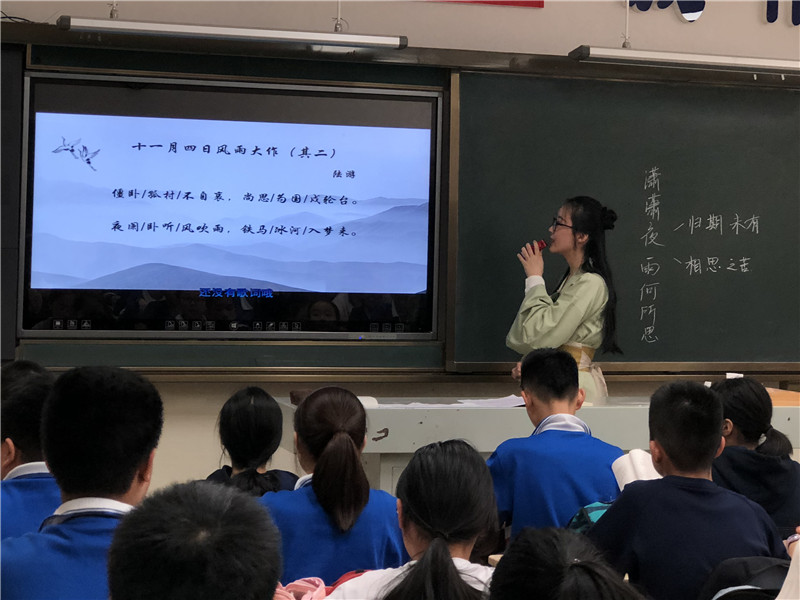 刘圣茜以“夜雨”这一意象串讲《夜雨寄北》和《十一月四日风雨大作》两首古诗,并把课堂分为听雨、品雨、写雨三个层次。她先请学生以诗歌内容为基础展开情境表演,巧妙引领学生进入诗歌情境,再从炼字、炼意等角度为学生详细分析诗中的情思。课堂自然地穿插有关时代背景的视频,以及缠绵细雨和狂风暴雨的音频,让学生通过图像与声音穿越晚唐与南宋,进而在“雨声”中去体味两首夜雨诗中不同的情思,“雨”与“情”交融。课堂气氛活跃而富有诗意,师生互动和谐。