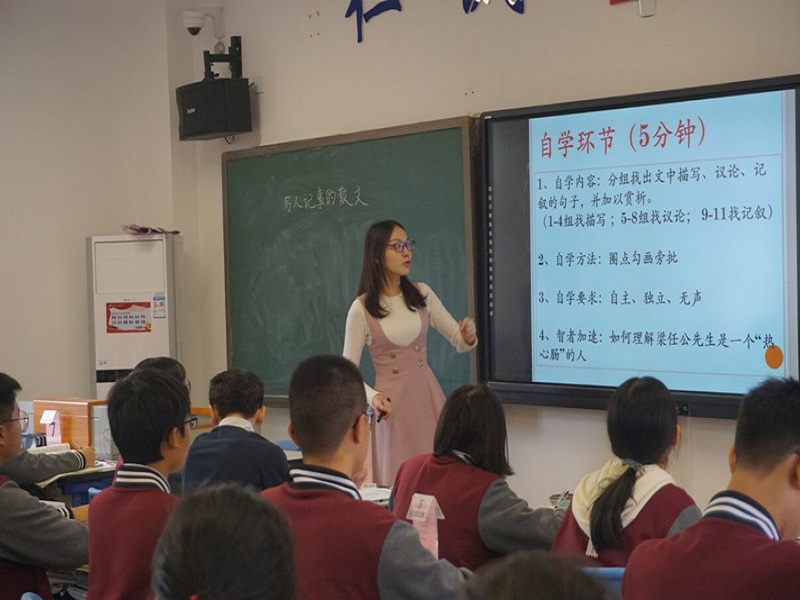 此次汇报课授课内容为《记梁任公先生的一次演讲》。课堂上,高钰霞向同学们展示了本堂课的教学目标,接着请李泽宇同学上台演讲,并请其他同学以“记李泽宇同学的一次演讲”为题做口头作文,以其与课文的对比作为切入点正式进入教学。高钰霞在此次课堂中采用自分教学模式,通过学生自学、组内互帮、成果展示、教师释疑等几个环节进行授课,将学、说、做、记四种学习行为落实到课中。整堂课气氛活跃,学生反响良好,展示了实习队在二附中一个多月来的实习成果。